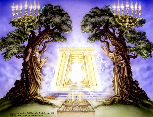 Today in Revelation chapter 11 we read about the Two Witnesses and the Seventh Trumpet bringing the third terror! The two witnesses in today’s reading are modeled after Moses and Elijah. They may be representing two actual believers who will be martyred or they may be symbolic of all testifying believers in the final days. Below are two incredible pieces of artwork from Pat Marvenko Smith of the two witnesses prophesying and being taken up to heaven: