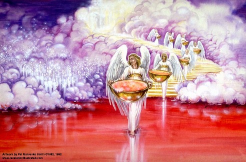 Bible.org’s commentary on today’s readings in Revelation chapter 16 titled “The Bowl Judgments” is at this link and “The Super Bowls” is at this link. Below is artist Pat Marvenko Smith’s “The Seven Bowl Judgments” and “The Plagues of the Seven Bowls: