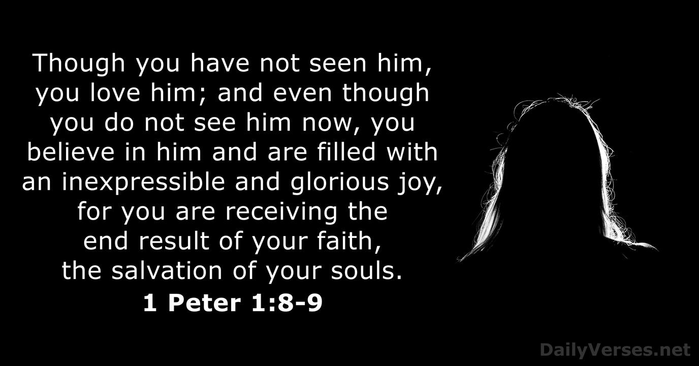 January 29, 2026 – Bible verse of the day – DailyVerses.netThough you have not seen him, you love him; and even though you do not see him now, you believe in him and are filled with an inexpressible and glorious joy, for you are receiving the end result of your faith, the salvation of your souls.Whom having not seen, ye love; in whom, though now ye see him not, yet believing, ye rejoice with joy unspeakable and full of glory: Receiving the end of your faith, even the salvation of your souls.Though you have not seen him, you love him. Though you do not now see him, you believe in him and rejoice with joy that is inexpressible and filled with glory, obtaining the outcome of your faith, the salvation of your souls.Whom having not seen you love. Though now you do not see Him, yet believing, you rejoice with joy inexpressible and full of glory, receiving the end of your faith—the salvation of your souls.You love him even though you have never seen him. Though you do not see him now, you trust him; and you rejoice with a glorious, inexpressible joy. The reward for trusting him will be the salvation of your souls.Although you have not seen him, you love him; and even though you do not see him now, you believe in him and rejoice with an indescribable and glorious joy, for you are receiving the outcome of your faith, the salvation of your souls.Whom, not having known, you love. In him, though now you don’t see him, yet believing, you rejoice greatly with joy that is unspeakable and full of glory, receiving the result of your faith, the salvation of your souls.And though you have not seen Him, you love Him, and though you do not see Him now, but believe in Him, you greatly rejoice with joy inexpressible and full of glory, obtaining as the outcome of your faith, the salvation of your souls.Although you have not seen him, you love him; and even though you do not see him now, you believe in him and are filled with a joy that is indescribable and glorious. For you are achieving the goal of your faith, that is, the salvation of your souls.