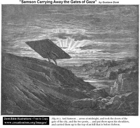 In Judges chapter 16 verse 3 we continue to see Samson’s strength – “But Samson stayed in bed only until midnight. Then he got up, took hold of the city gates with its two posts, and lifted them, bar and all, right out of the ground. He put them on his shoulders and carried them all the way to the top of the hill across from Hebron.”