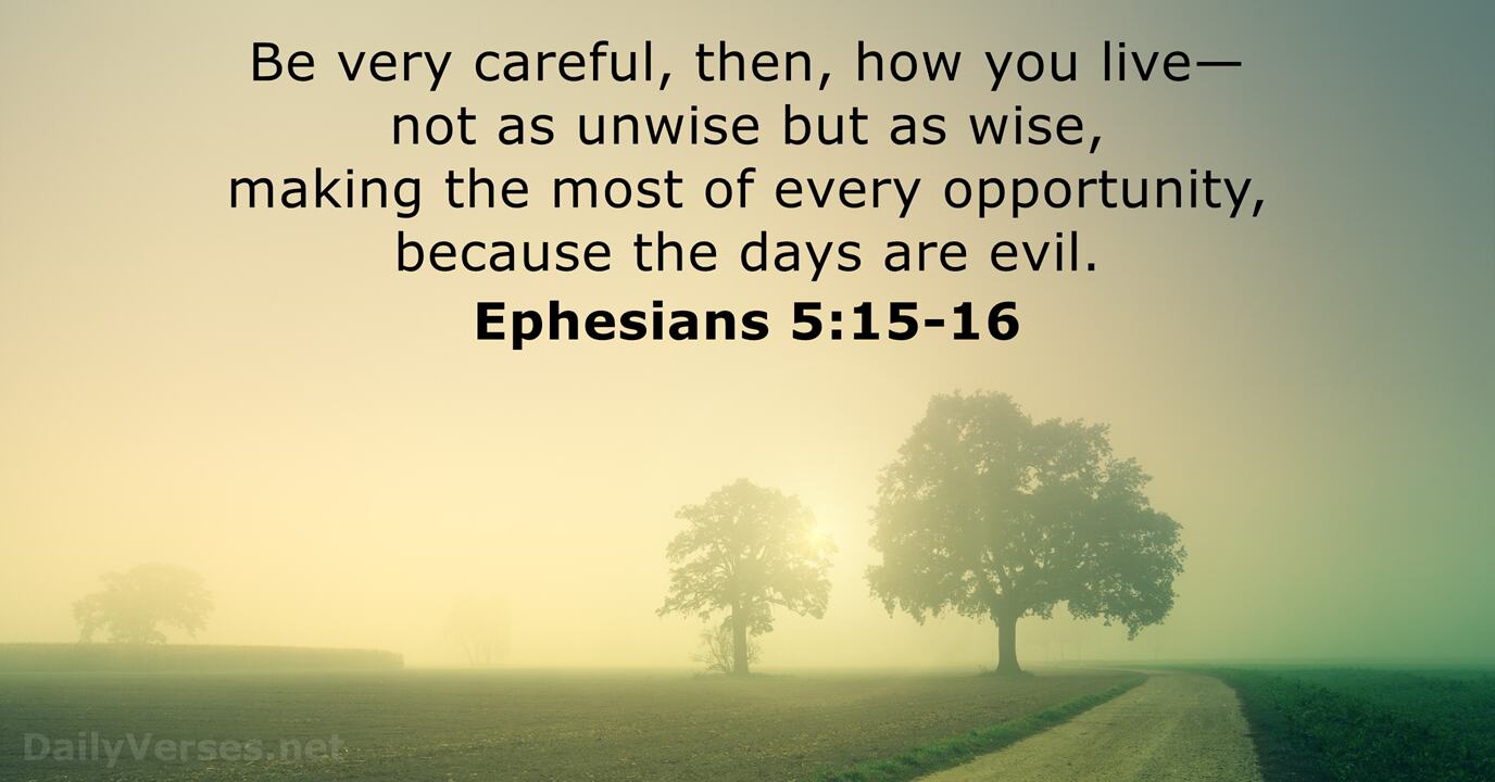 April 7, 2026 – Bible verse of the day – DailyVerses.netBe very careful, then, how you live—not as unwise but as wise, making the most of every opportunity, because the days are evil.See then that ye walk circumspectly, not as fools, but as wise, Redeeming the time, because the days are evil.Look carefully then how you walk, not as unwise but as wise, making the best use of the time, because the days are evil.See then that you walk circumspectly, not as fools but as wise, redeeming the time, because the days are evil.So be careful how you live. Don’t live like fools, but like those who are wise. Make the most of every opportunity in these evil days.Be careful then how you live, not as unwise people but as wise, making the most of the time, because the days are evil.Therefore watch carefully how you walk, not as unwise, but as wise, redeeming the time, because the days are evil.So then, be careful how you walk, not as unwise people but as wise, making the most of your time, because the days are evil.Therefore, take care to live as intelligent people, and do not be like those who are senseless. Make the most of the present time, for this is a wicked age.He will cover you with his feathers,