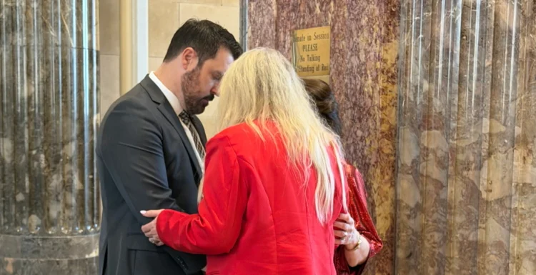 IFA LA State Co-Leader Janie Harris and IFA Regional Leader Lisa Townsend pray with legislators.