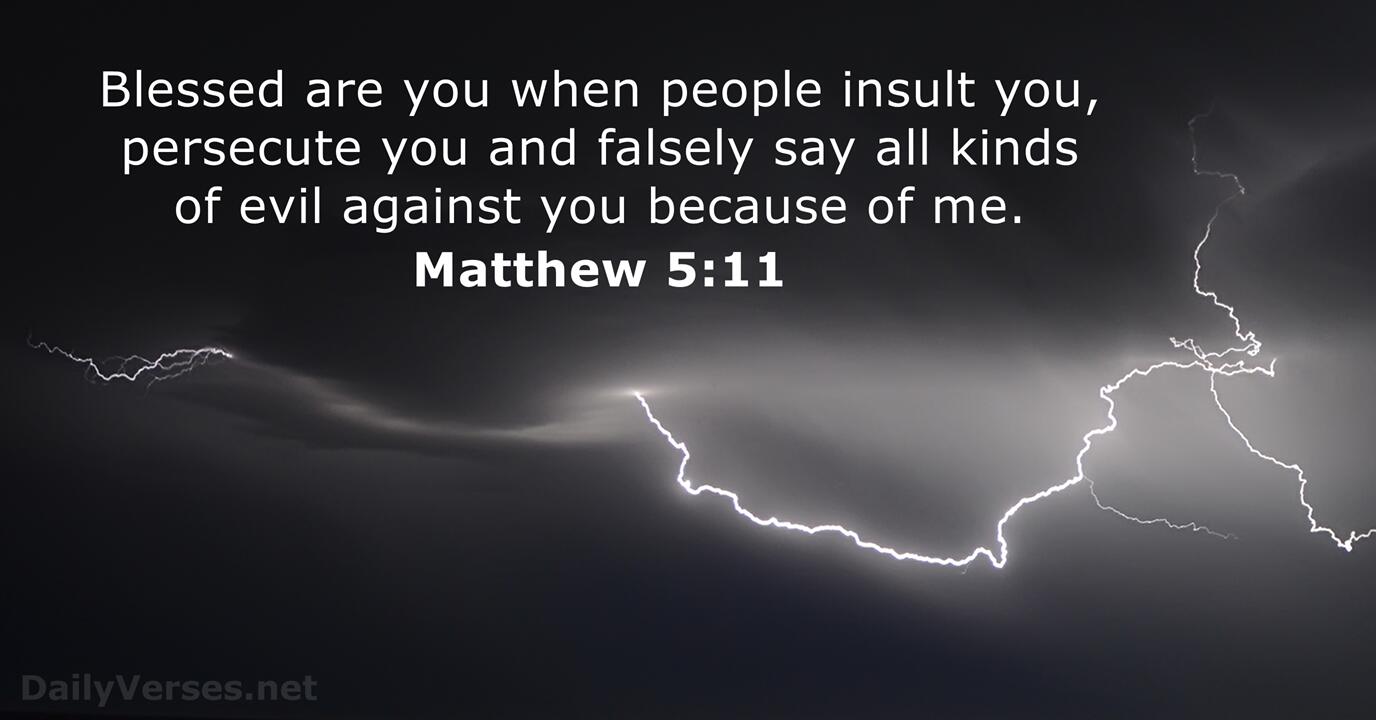 April 11, 2026 – Bible verse of the day – DailyVerses.netBlessed are you when people insult you, persecute you and falsely say all kinds of evil against you because of me.Blessed are ye, when men shall revile you, and persecute you, and shall say all manner of evil against you falsely, for my sake.Blessed are you when others revile you and persecute you and utter all kinds of evil against you falsely on my account.Blessed are you when they revile and persecute you, and say all kinds of evil against you falsely for My sake.God blesses you when people mock you and persecute you and lie about you and say all sorts of evil things against you because you are my followers.Blessed are you when people revile you and persecute you and utter all kinds of evil against you falsely on my account.Blessed are you when people reproach you, persecute you, and say all kinds of evil against you falsely, for my sake.Blessed are you when people insult you and persecute you, and falsely say all kinds of evil against you because of Me.Blessed are you when people insult you and persecute you and utter all kinds of calumnies against you for my sake.Are not five sparrows sold for two pennies? Yet not one of them is forgotten by God. Indeed, the very hairs of your head are all numbered. Don’t be afraid; you are worth more than many sparrows.Love does not delight in evil but rejoices with the truth. It always protects, always trusts, always hopes, always perseveres.Next verse!With image