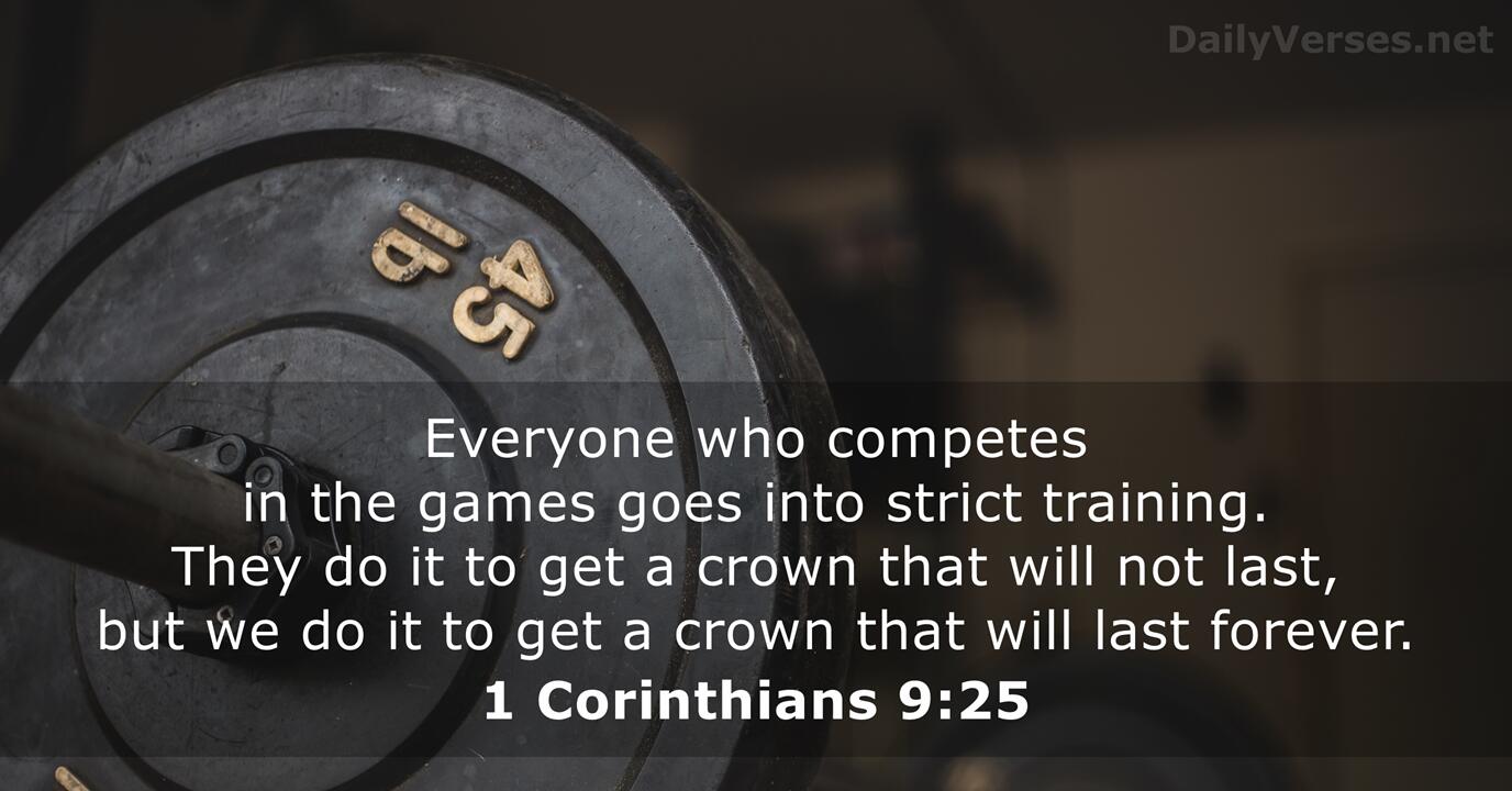 April 16, 2026 – Bible verse of the day – DailyVerses.netEveryone who competes in the games goes into strict training. They do it to get a crown that will not last, but we do it to get a crown that will last forever.And every man that striveth for the mastery is temperate in all things. Now they do it to obtain a corruptible crown; but we an incorruptible.Every athlete exercises self-control in all things. They do it to receive a perishable wreath, but we an imperishable.And everyone who competes for the prize is temperate in all things. Now they do it to obtain a perishable crown, but we for an imperishable crown.All athletes are disciplined in their training. They do it to win a prize that will fade away, but we do it for an eternal prize.Athletes exercise self-control in all things; they do it to receive a perishable wreath, but we an imperishable one.Every man who strives in the games exercises self-control in all things. Now they do it to receive a corruptible crown, but we an incorruptible.Everyone who competes in the games exercises self-control in all things. So they do it to obtain a perishable wreath, but we an imperishable.Everyone who seeks a prize submits himself to rigorous self-discipline in every respect. They do so to win a perishable crown, while we seek an imperishable one.What a person desires is unfailing love;