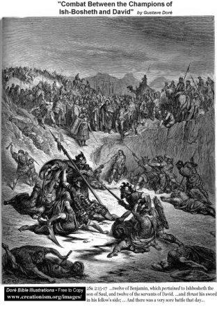 Old Testament – Today’s Second Samuel readings are quite dramatic! We start off with the beginnings of what I think you could call a civil war between Judah and Israel in chapter 2 verses 15 through 17: “So twelve men were chosen to fight from each side—twelve men of Benjamin representing Ishbosheth son of Saul, and twelve representing David. Each one grabbed his opponent by the hair and thrust his sword into the other’s side so that all of them died. So this place at Gibeon has been known ever since as the Field of Swords. A fierce battle followed that day, and Abner and the men of Israel were defeated by the forces of David.”