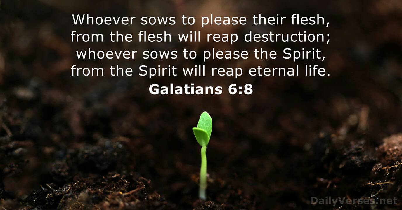 April 22, 2026 – Bible verse of the day – DailyVerses.netWhoever sows to please their flesh, from the flesh will reap destruction; whoever sows to please the Spirit, from the Spirit will reap eternal life.For he that soweth to his flesh shall of the flesh reap corruption; but he that soweth to the Spirit shall of the Spirit reap life everlasting.For the one who sows to his own flesh will from the flesh reap corruption, but the one who sows to the Spirit will from the Spirit reap eternal life.For he who sows to his flesh will of the flesh reap corruption, but he who sows to the Spirit will of the Spirit reap everlasting life.Those who live only to satisfy their own sinful nature will harvest decay and death from that sinful nature. But those who live to please the Spirit will harvest everlasting life from the Spirit.If you sow to your own flesh, you will reap corruption from the flesh; but if you sow to the Spirit, you will reap eternal life from the Spirit.For he who sows to his own flesh will from the flesh reap corruption. But he who sows to the Spirit will from the Spirit reap eternal life.For the one who sows to his own flesh will reap destruction from the flesh, but the one who sows to the Spirit will reap eternal life from the Spirit.The one who sows in his flesh will reap a harvest of corruption, but the one who sows in the Spirit will reap from the Spirit the reward of eternal life.Blessed are those who hunger and thirst for righteousness,